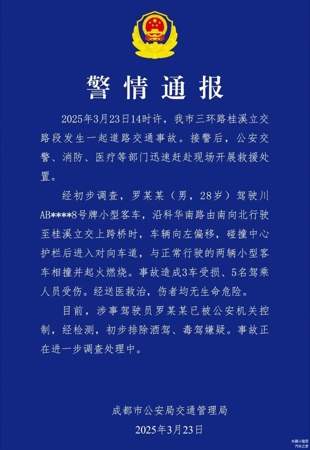 根据警方通报,涉事驾驶员罗某某已被公安机关控制,经检测,初步排除酒驾、毒驾嫌疑。事故正在进一步调查处理中。