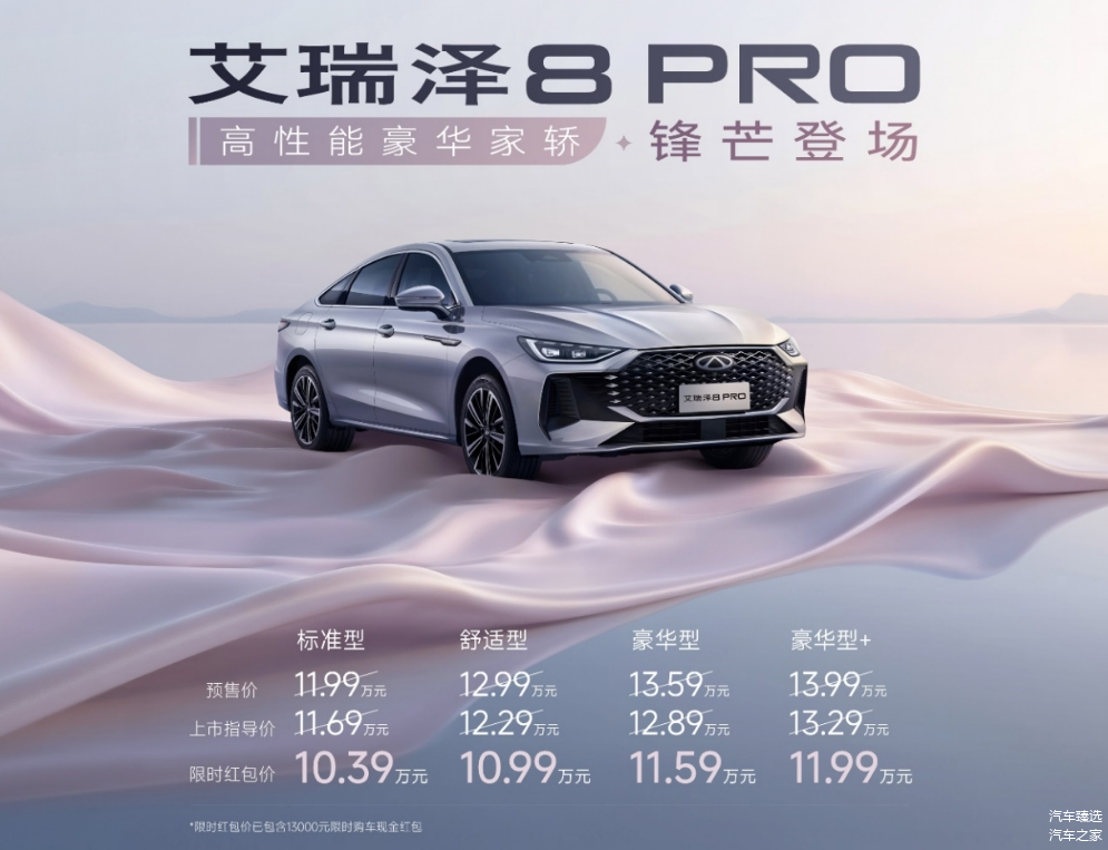 3月22日晚,奇瑞汽车旗下 艾瑞泽8 PRO(图片 | 参数 | 询价)正式上市。新车共推出4款车型,上市指导价为10.39万-13.29万元;限时红包价为10.39万—11.99万元。