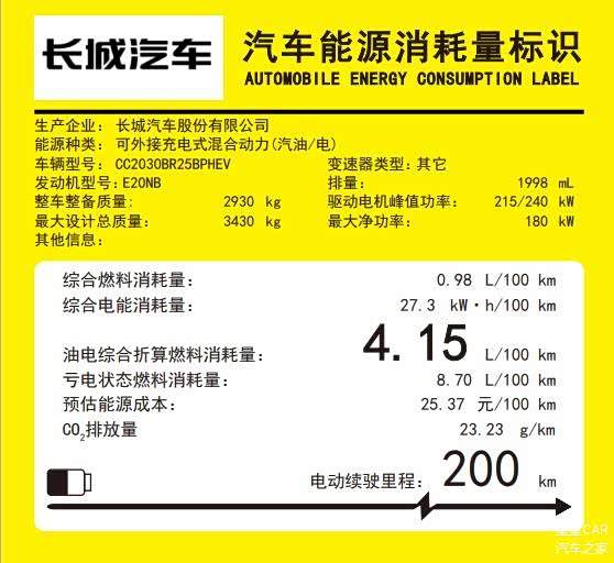 至于内饰部分,现在并没有公布;不过在动力部分,新车将采用2.0T发动机+前后双电机的动力组合;其中,2.0T发动机最大净功率为180kW,电动机的最大功率分别为215kw和240kw,统综合功率645千瓦,综合扭矩1195牛・米。新车的百公里综合油耗为0.98L,最低荷电状态油耗为百公里8.7L,纯电续航里程为200公里。