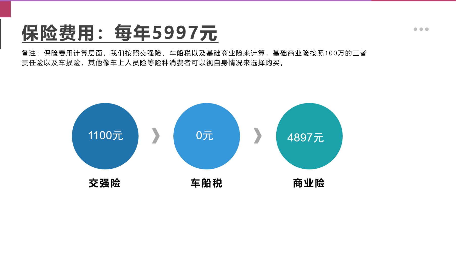 保险费用计算层面,我们按照交强险、车船税以及基础商业险来计算,基础商业险按照100万的三者责任险以及车损险,其它像车上人员险等险种消费者可以视自身情况来选择购买。我们的价格不考虑多年不出险的市场折扣价。