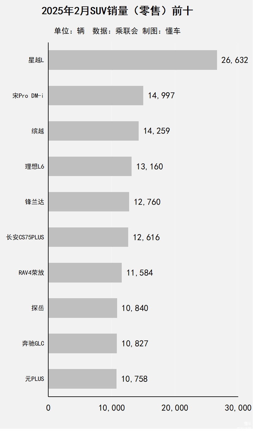 吉利星越L连续两个月拿下SUV销量冠军,2月销量达到了26,632辆,是唯一销量破2万辆的SUV车型,比排在第二的宋Pro DM-i多了1.16万辆。