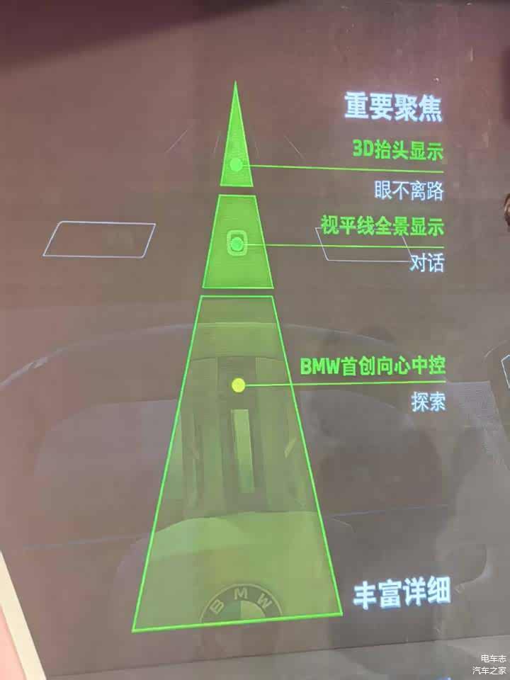 在活动现场,宝马带来的新世代超感智能座舱揭开了谜底。其最核心的内容之一是宝马首创的视平线全景显示技术,借助宝马自研的超近距投影平视显示技术,将驾驶信息、导航、驾驶辅助、娱乐信息等内容投射至前挡风玻璃下沿的黑色区域,革命性地替代了传统的仪表盘,可实现从A柱到A柱的超宽视域投影画面。