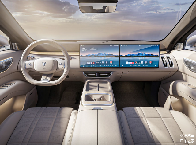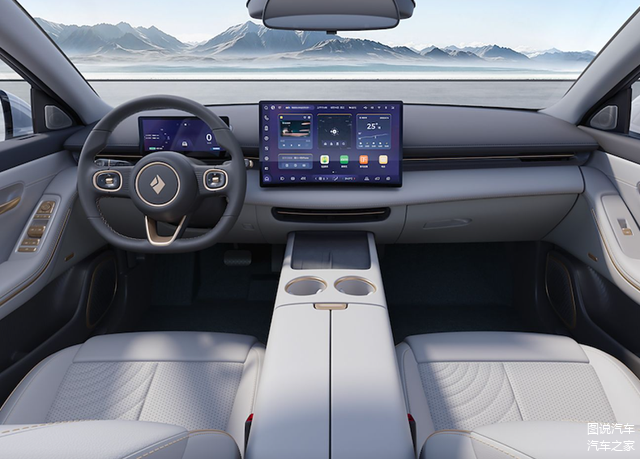 内饰采用时下流行的极简风设计,取消传统挡杆,采用电子怀挡,释放空间,悬浮仪表盘+悬浮中控显示大屏,环抱式布局,中控台有层次感,从官图来看,应该会有无线充电等功能。