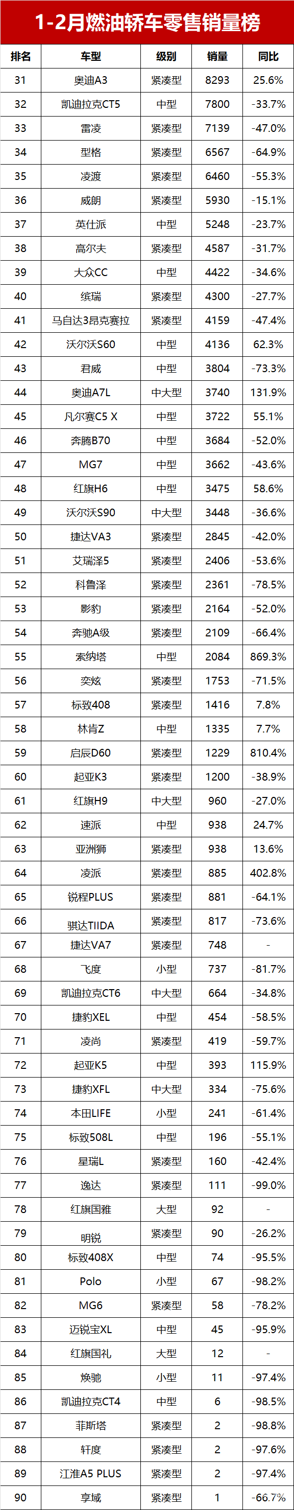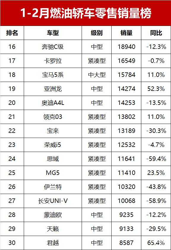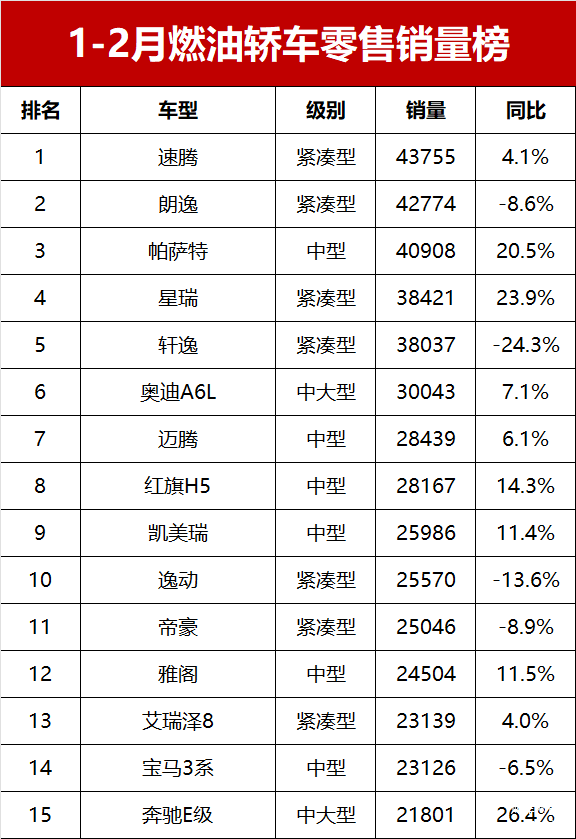 【2025年1-2月燃油轿车零售销量排行榜】进入2025年国内新能源轿车市场继续保持高速增长的势头,但常规燃油车依然在轿车市场上占据重要的地位。乘联会数据显示,今年1-2月国内燃油轿车市场零售销量为77.8万辆,虽然同比减少15.4%,但仍在轿车市场上拥有52.2%的份。1-2月燃油轿车零售销量榜!大众竟包揽前三,日系跌至谷底,思域创新低!