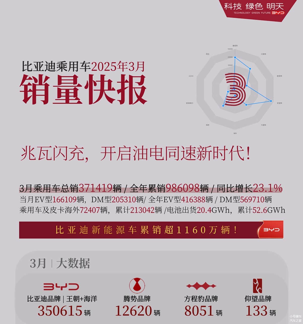 从最新公布的战报来看,比亚迪3月份乘用车销量371419辆,其中纯电动车型销量166109辆,插混车型销量205310辆,自从第五代DM车型上市之后,比亚迪插混和纯电销量势均力敌的局面逐渐被打破了,证明带油箱的新能源车,还是消费者最喜欢的。