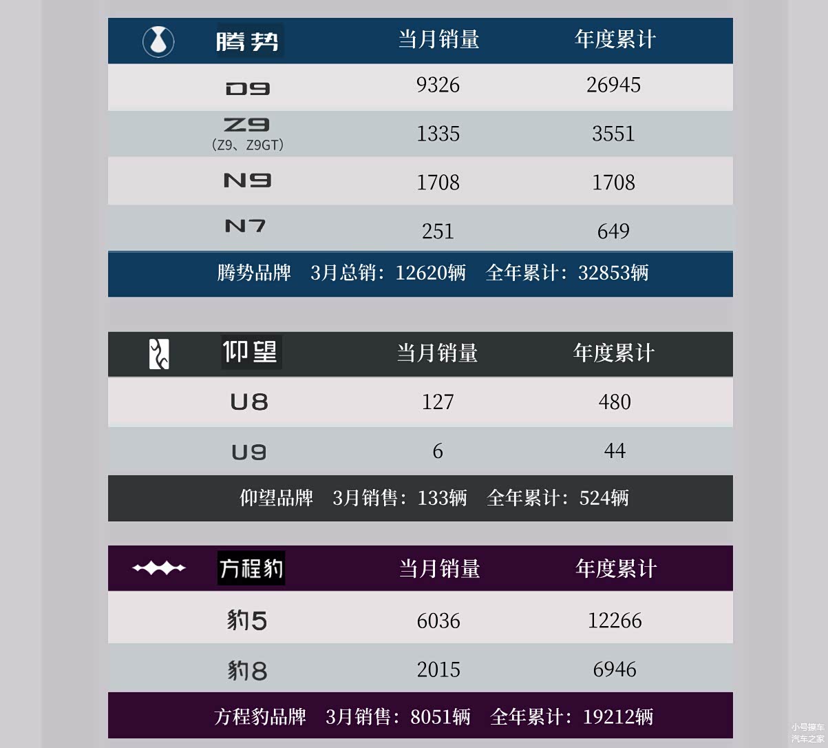 腾势品牌方面,3月份销量12620辆,其中D9销量9326辆,Z9家族销量1335辆,N9刚上市就交付1708辆,N7卖出了251辆。Z9家族由于定位的原因,没能成为爆款,但N9真的有爆款潜质。