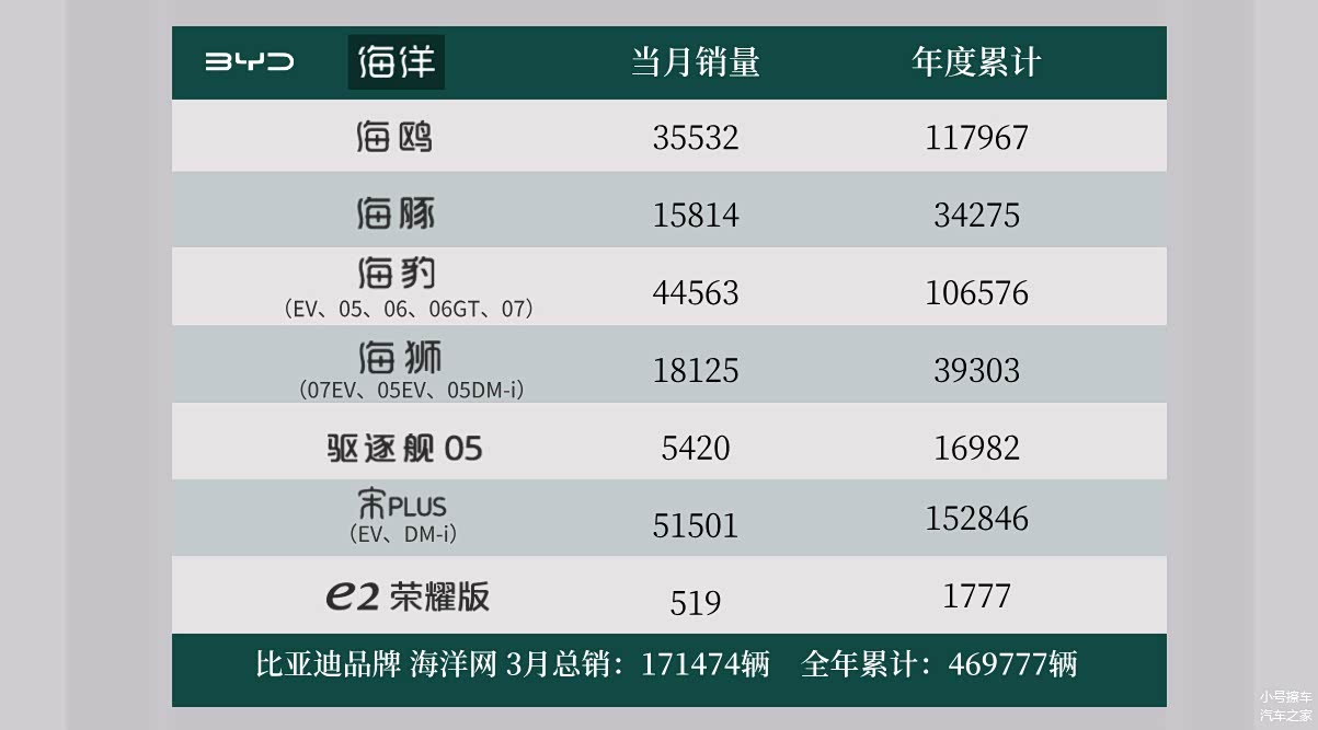 海洋网方面,海鸥3月份销量35532辆,年度累计接近12万辆;海豚3月份销量15814辆,年度累计超过3.4万辆;作为纯电动小车,随着对手不断增加,销量受影响也很明显,想要回到月销超4万甚至5万的情况,应该是很难了。