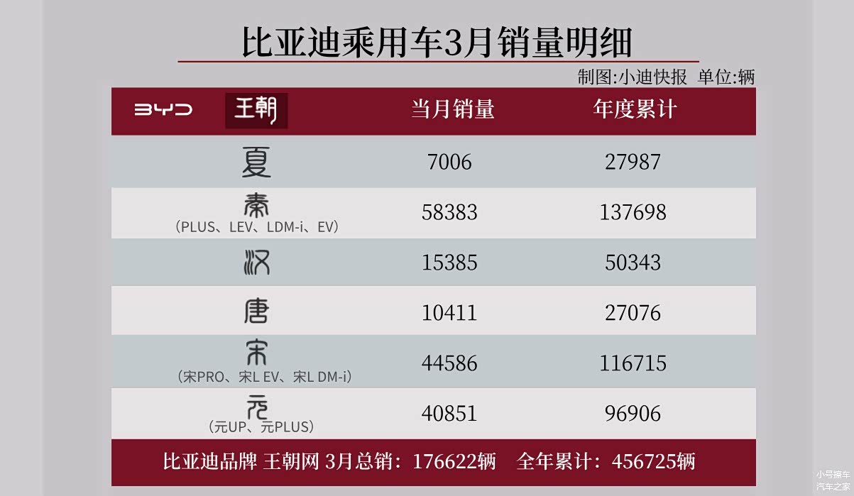 汉家族依旧强势,3月份销量15385辆,年度累计也超过5万辆;唐家族3月销量10411辆,年度累计超过2.7万辆,随着4月份汉L和唐L上市,比亚迪王朝旗舰家族的销量势必还会有进一步的提升。