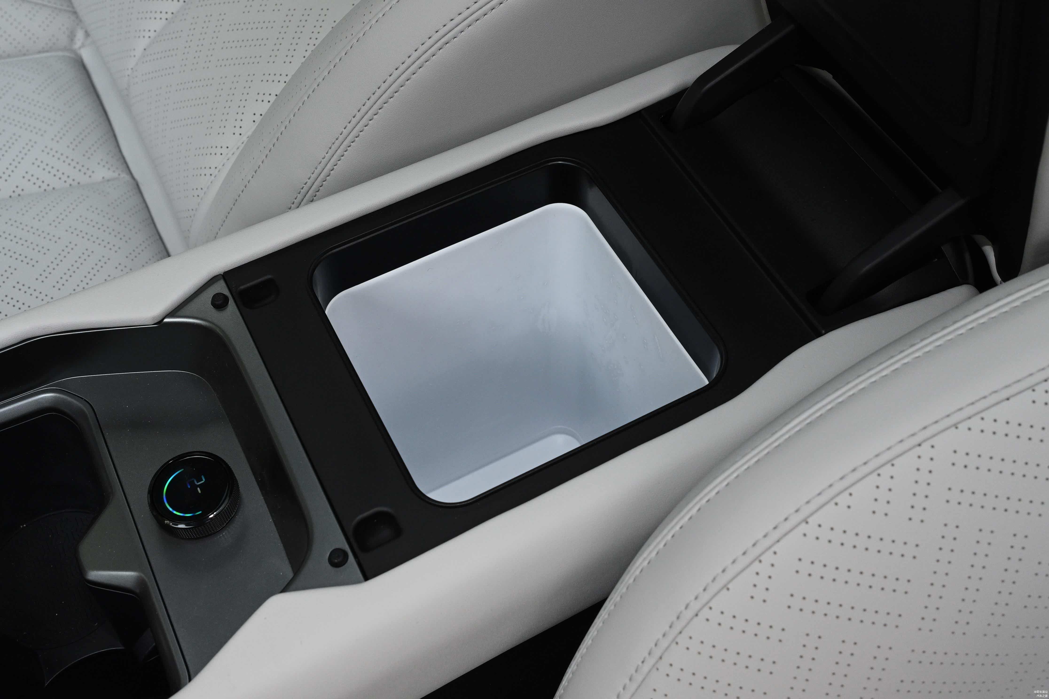 储物方面,常规状态下行李舱纵深较浅,但后排座椅支持 40:60 比例放倒,扩展后能形成平整空间,满足大件物品装载需求。车内储物格布局实用,车门拉手带储物槽,中央扶手箱容积可观,前后排均设有杯架和 USB 接口。全系标配的车载冰箱位于后排中央通道,容积虽不大,但支持三温区调节,适合放置饮料或小件物品。