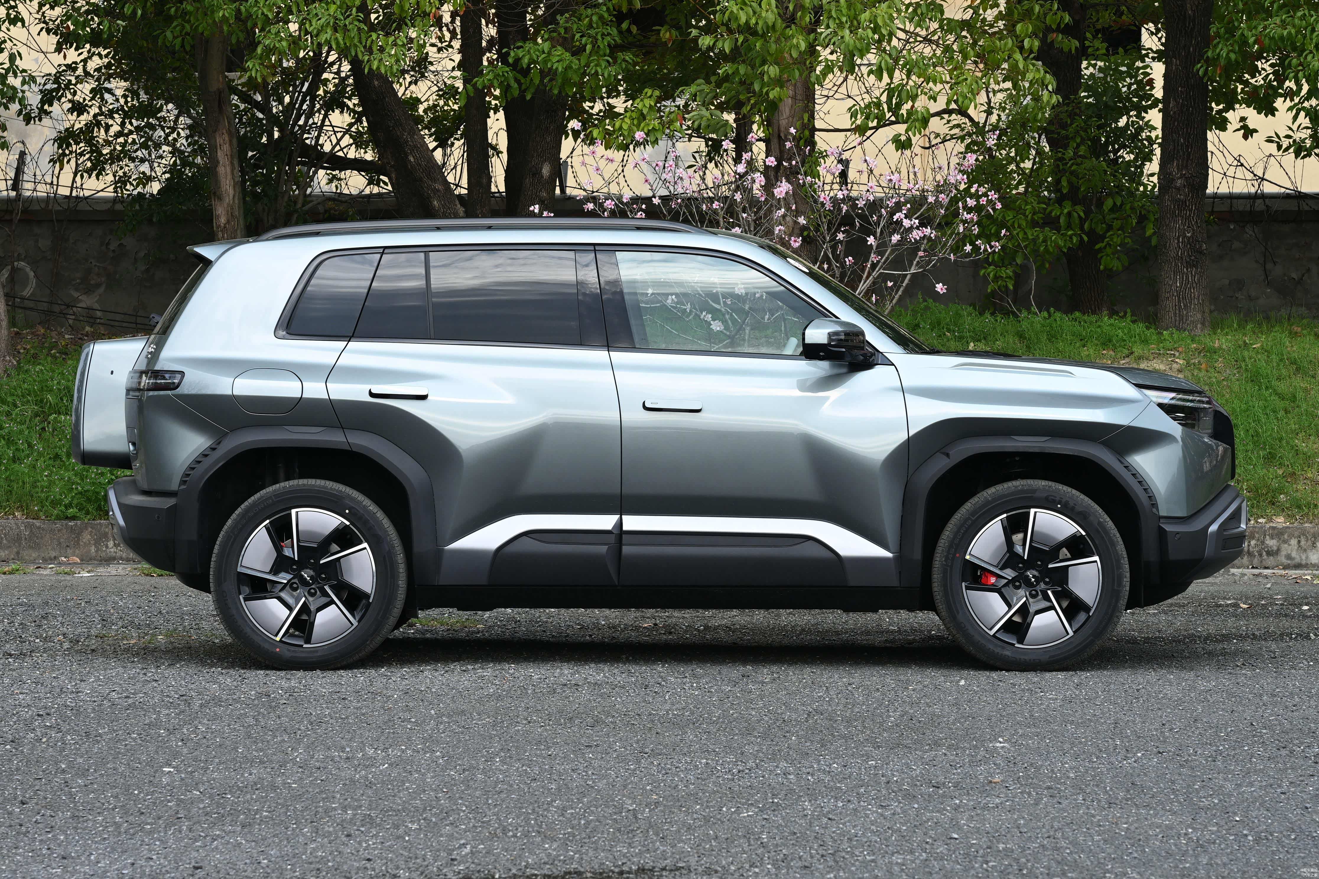 B 柱采用熏黑处理形成悬浮车顶效果,后窗上扬角度优化了车尾比例。车侧底部配备黑色防擦条与银色下护板,兼顾实用性与外观质感。后视镜集成 LED 转向灯,支持电动调节与加热功能。轴距与车长的黄金比例分配,在保证车内空间利用率的同时,使侧面线条更显修长。这种设计既满足了城市通勤的审美需求,也通过结构优化提升了车辆通过性,符合家庭用户对多功能车型的使用需求。