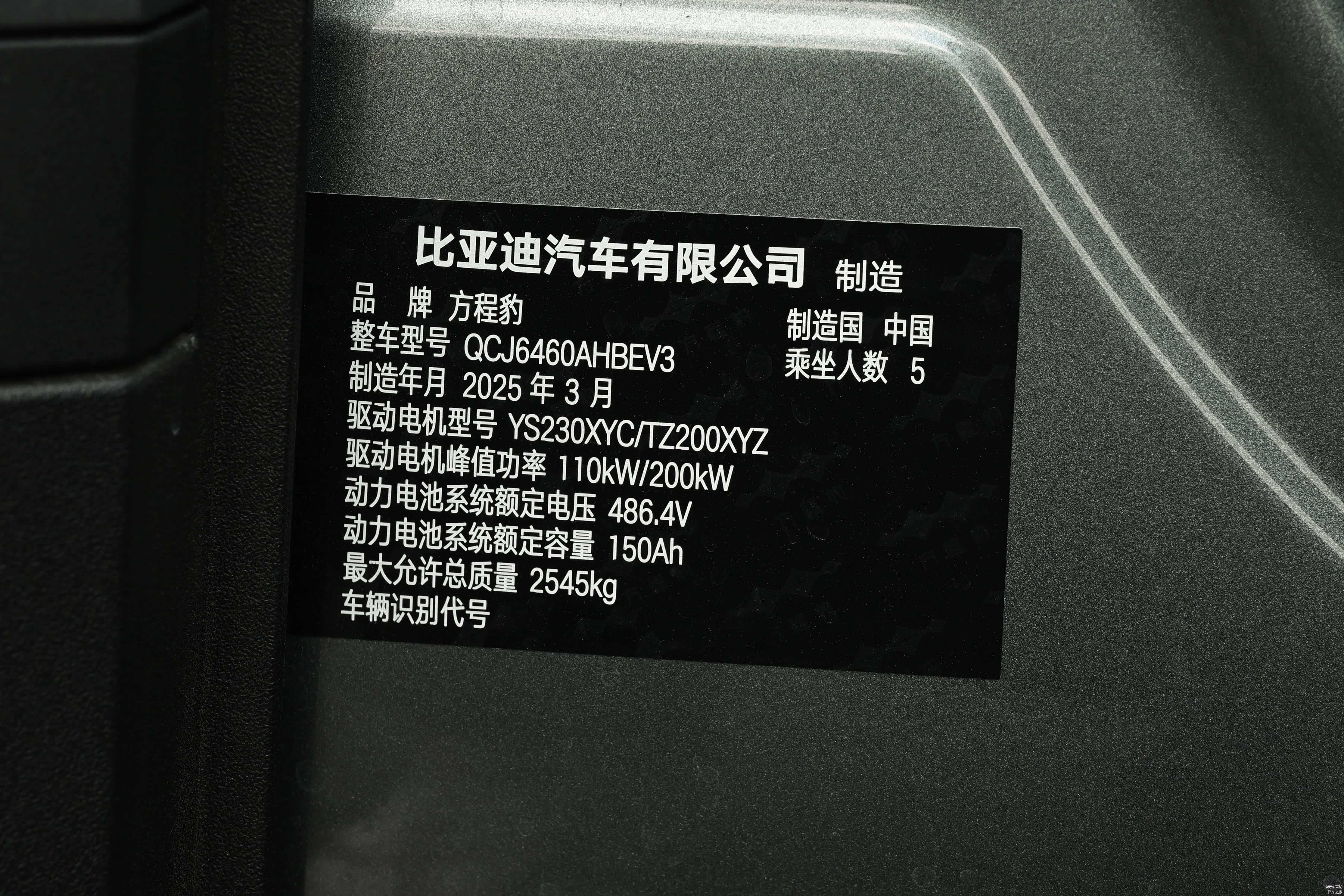 方程豹钛 3 车身侧面采用双腰线设计,上腰线从前翼子板延伸至尾灯,下腰线形成内凹曲面,搭配悬浮式车顶结构,营造出俯冲式视觉效果。车身尺寸为 4605mm×1900mm×1720mm,轴距达 2745mm,后排腿部空间表现优于同级别车型。外扩式轮拱设计搭配 245/50 R19 规格轮胎,既增强了车身力量感,也为车辆通过性提供支撑。车门采用隐藏式门把手设计,与车身曲面自然衔接,降低风阻系数。