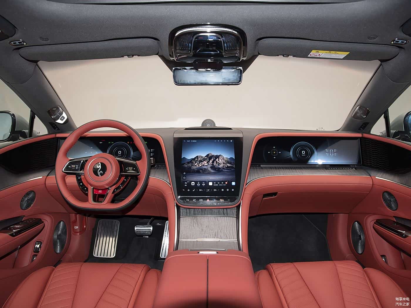 内饰方面,仰望U7的双环抱座舱沿袭了中式建筑的对称之美,大面积辅以高档的真皮材质以及木纹饰板点缀,豪华感扑面而来,提供云锦红、珠缎白两种颜色选择,很有东方美学的韵味。提供四座旗舰和五座豪华两个版本,座椅采用Nappa真皮包裹,前排可实现20向调节,涵盖腰部支撑、通风、加热、按摩等功能,四座版本后排配备2个独立座椅,可以一键开启舒享功能,车内乘员能以卧躺的姿势乘车,配合23个丹拿铂金证据系列Hi-End级扬声器,仪式感满满。