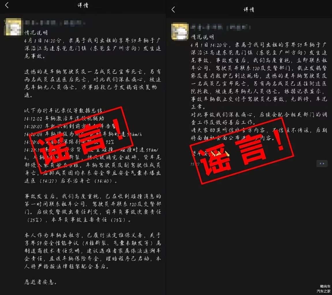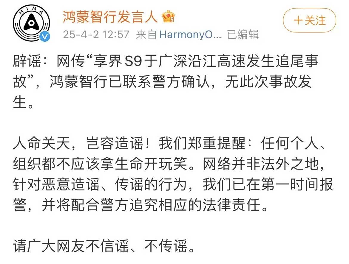 4月2日,鸿蒙智行严正声明否认" 享界S9(图片 | 参数 | 询价)高速追尾致三人死亡"传闻,称经警方核实无此事故发生,已对造谣者报警追责。该谣言源于抖音用户"李泽熙(科技虾)"发布的"情况说明",称4月1日其公司租赁的享界S9在激活车道领航辅助后与货车碰撞,造成A柱断裂、气囊未触发等问题。