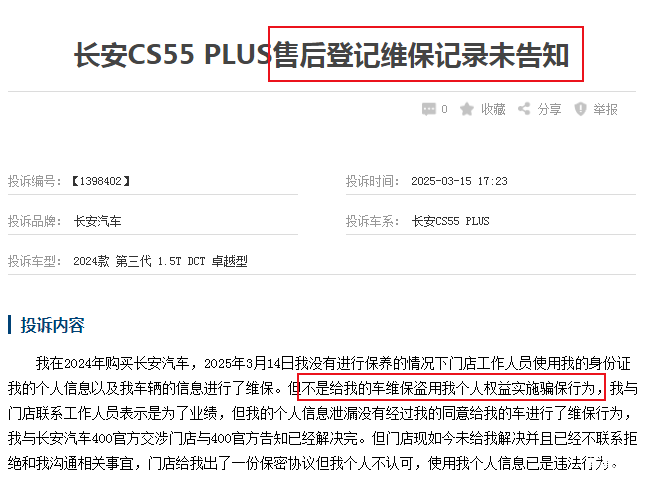 在第三方网站查询,一位长安CS55 PLUS车主反映: