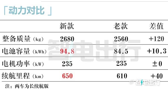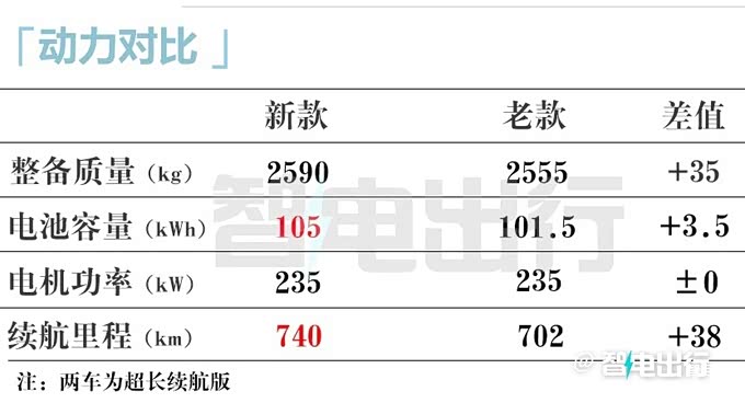 新车外观、尺寸与现款一致,增2款新轮毂,整备质量增加,电池更大,超长续航版续航提升至740km。还有全系标配图灵AI智驾+5C超充AI电池,加入电容方向盘、智驾小蓝灯等,但激光雷达肯定没了。