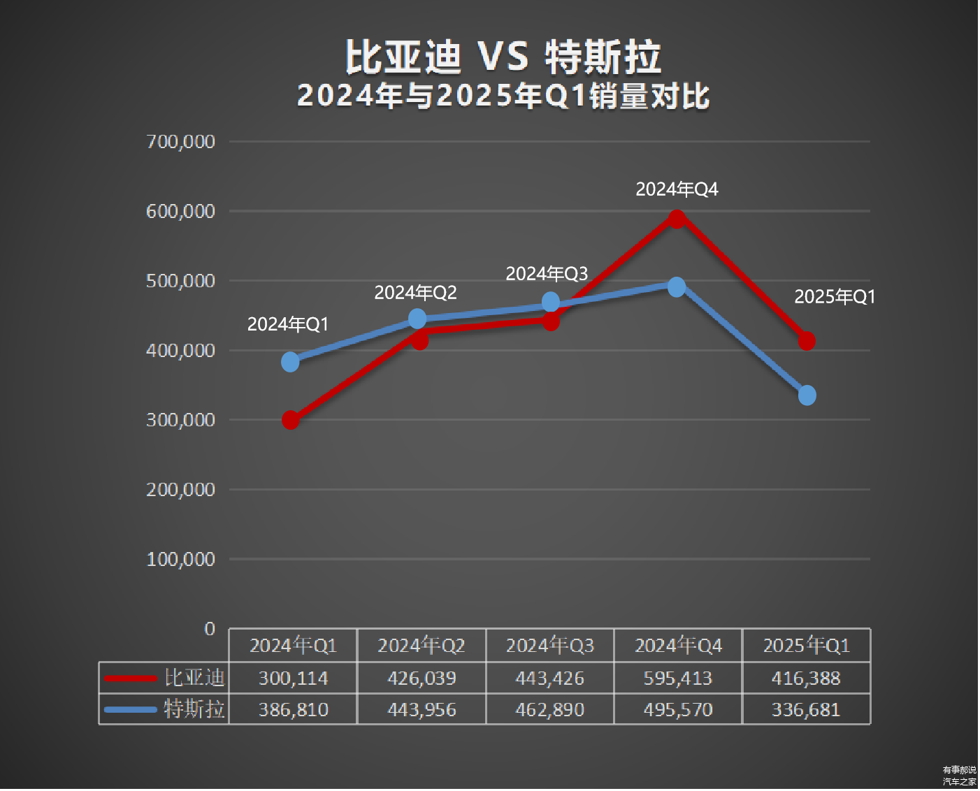 数据显示,2024年四季度,比亚迪全球纯电销量首超特斯拉,今年一季度,实现第二次赶超,再次登顶全球纯电销冠。特斯拉今年一季度销量为33.67万辆,同比下降13%。