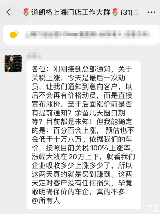 而经销商和直营门店的日子同样不好过,毕竟关税上涨的成本它们也得扛着,要么选择直接涨价,要么就是及时止损清理现有库存不再进口,目前网上已流出的道朗格门店群聊内容中就已明确发出通知要对现有车型涨价,大约20万上下。