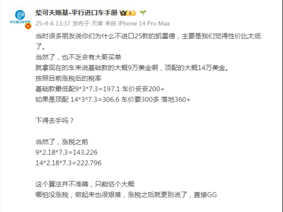 这波加征关税,像一些大排量美产进口车涨价幅度不带小的,笔者关注的一位平行进口商就算了下25款凯雷德的账,加征关税后低配车价得涨大几十万,顶配甚至涨了超百万,这谁看了谁下得去手啊?本来做起来就很难,这下更没戏了,这也令很多平行进口商苦恼,要么干脆不再做这类车型的生意,要么就得另辟蹊径换其他产地的货源,供应得不到保障。