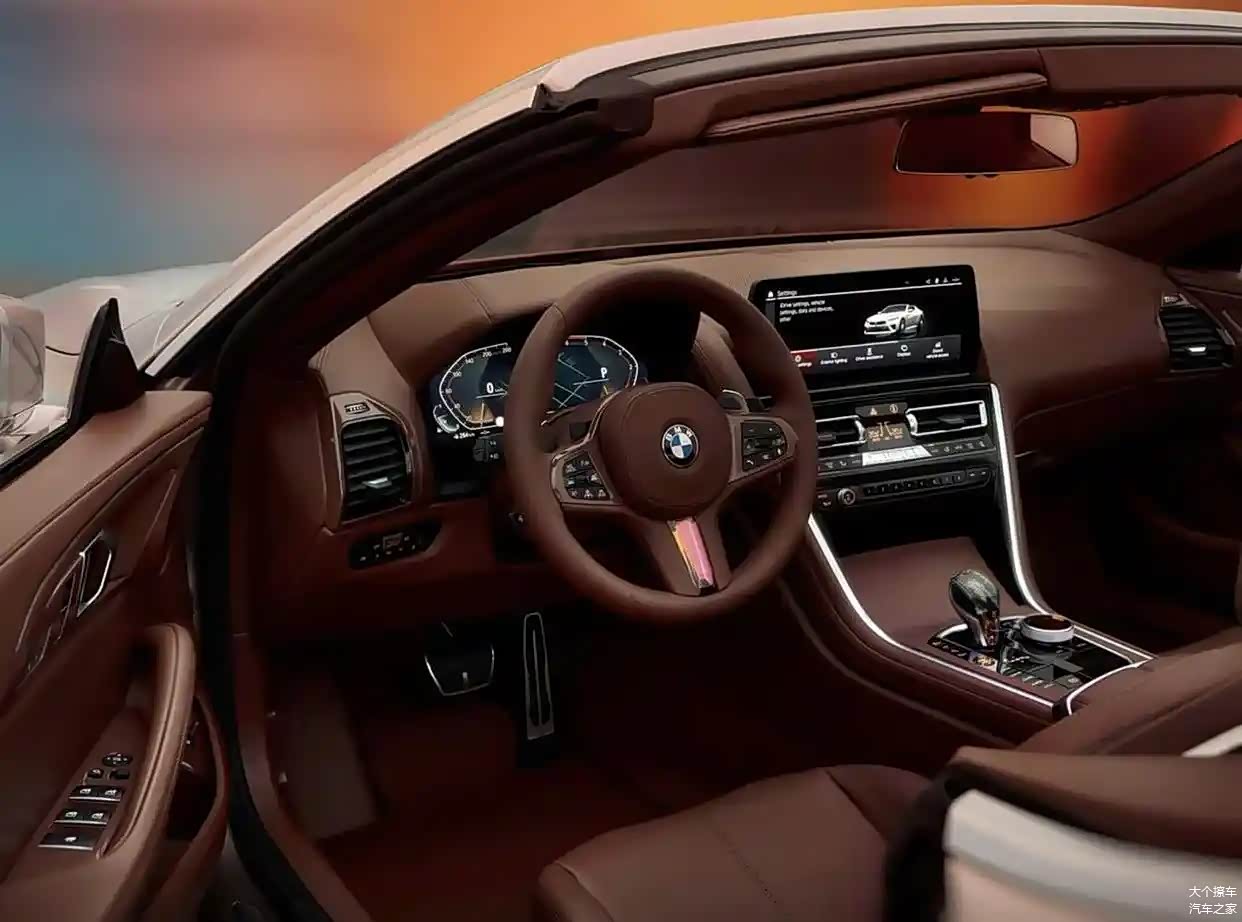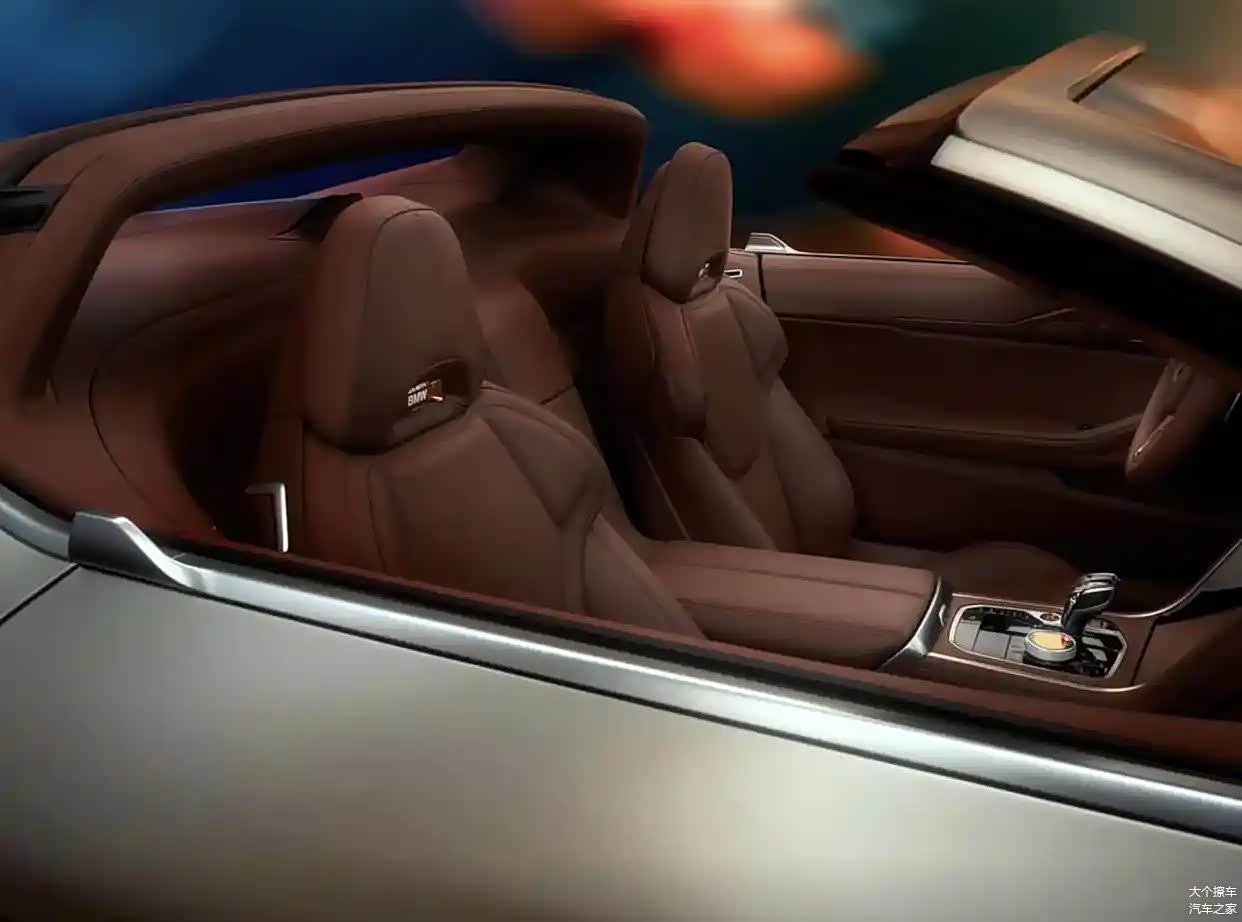 宝马Skytop概念车的内部装饰延续了宝马M8的经典设计思路,其大面积的黑色钢琴烤漆面板与卢马棕色的Merion真皮材料和真皮座椅相结合,给人一种充满活力和期待的感觉。BMW Skytop徽标和宝马M三色运动徽标随处可见,从细微之处也能感受到这款车的非凡之处。中控台上装有配备四个换挡拨片的M运动方向盘和M运动换挡手柄,再加上红色的一键启动按钮,极大地提升了整车的战斗氛围。这款12.3英寸的全液晶显示设备和10.25英寸的悬浮式中控液晶屏都采用了M运动化的主题设计,非常引人注目。在操控岛区域,你还可以找到你熟悉的水晶挡把、水晶质感的大颗粒按键和大尺寸的圆形选最。此外,座椅还配备了布洛克风格的真皮座椅,并在座椅后方设计了一个独特的防滚架。