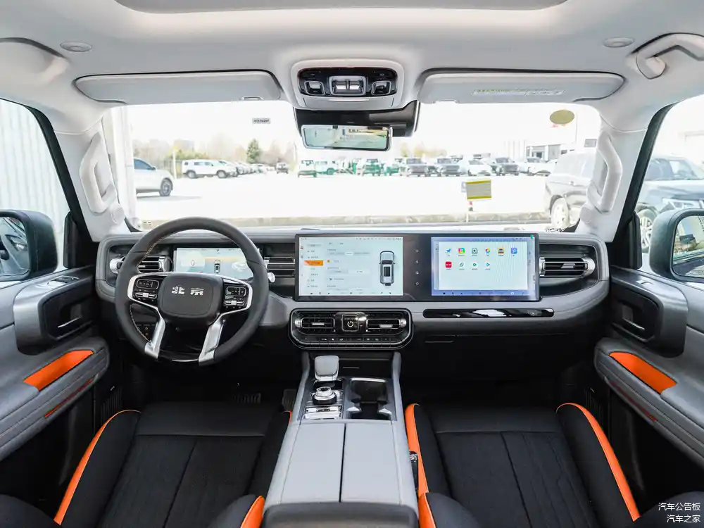 内饰也是延续了燃油版的设计,同时12.8英寸中控屏和12.8英寸副驾屏相连的双联屏设计,加上10.25英寸全液晶仪表的组合,科技感同样非常强。当然了,车内大量平直线条以及物理按键和旋钮的使用,还是能明显看出其硬派越野的属性。