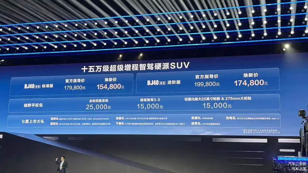 随着新能源技术的成熟,像MPV、皮卡以及硬派越野等车型也都有新能源车了,不过硬派越野主要还是纯电居多,但考虑到它的场景都是户外,因此消费者还是更偏向于燃油车。别急,北京BJ40就于4月7日推出了增程版车型,新车共推出2款车型,售价分别为17.98万和19.98万元,同时官方还给出了焕新价,分别是15.48万和17.48万元。至于新车到底如何,我们接着看下去。