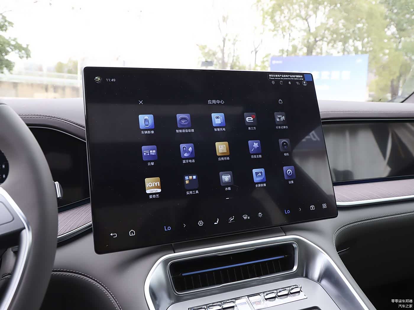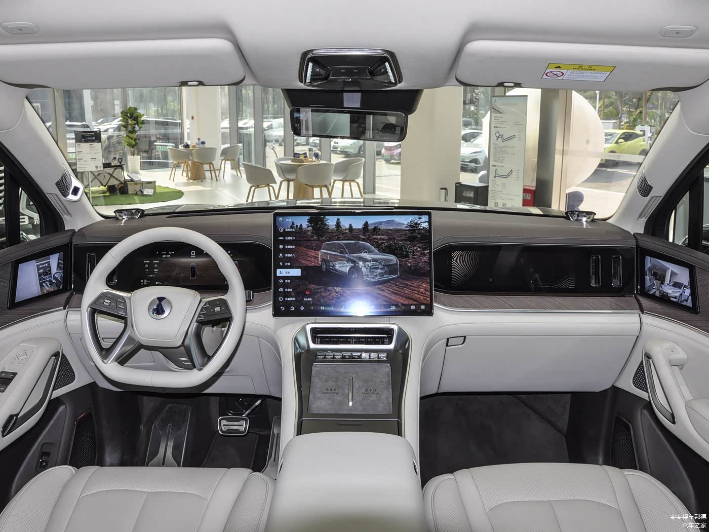 内饰方面,车内采用铂檀灰+云锦米双色搭配,对称式中控台配备17.3英寸悬浮屏、双12.3英寸仪表/副驾屏及50英寸AR-HUD抬头显示,形成“四屏联动”。6座布局全系标配云栖座椅,支持20向电动调节、加热/通风/按摩功能,副驾零重力座椅可一键展开160°躺姿,第三排首创座垫抬升功能,媲美MPV舒适性。创新性“666”空间布局支持46处储物设计,满载6人时仍可容纳6个行李箱+6个背包,或横置47英寸高尔夫球包。3.2㎡全景天幕、帝瓦雷剧院级音响及11L智能冷暖三开冰箱,打造“移动起居室”体验。