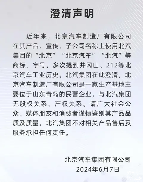 “北汽集团”曾多次声明与“北汽制造”无关,2024年“北汽制造”发布新212后,“北汽集团”随即紧急澄清。戏剧的是,此举却被指“拉踩前小弟不够大气”。