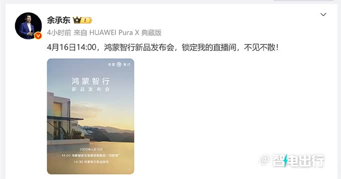 家人们,重大消息来啦!4月16日下午2点,鸿蒙智行要搞一场超震撼的新品发布会,那阵仗,简直就是汽车界的 “春晚”,绝对不容错过!