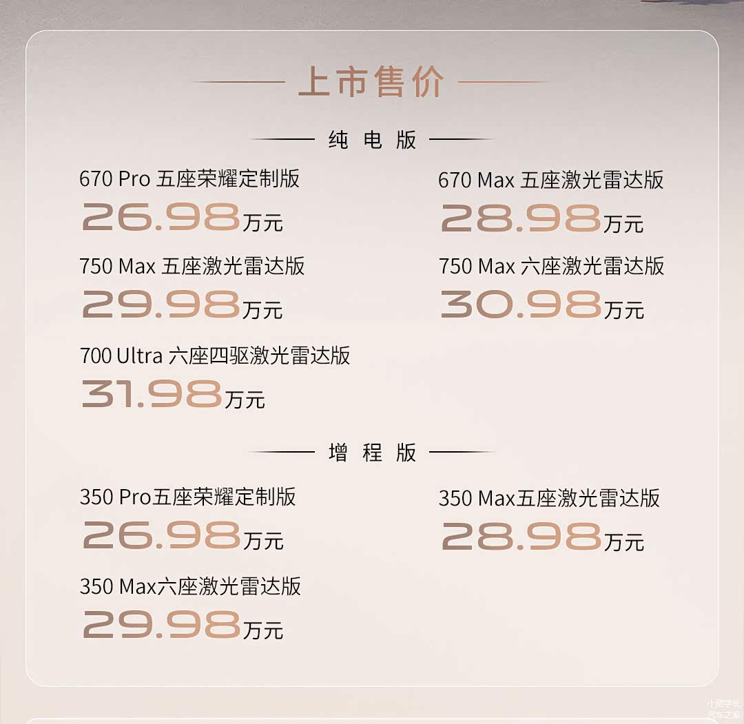 动力上昊铂 HL 提供增程和纯电双动力,纯电版采用全域 800V 高压平台,纯电入门车型(670 Pro五座荣耀定制版)配备95.9kWh三元锂电池(弹匣电池),CLTC工况续航里程为670km,支持3C超充,soc30%-80%电量需15分钟;其他版本(750 Max五/六座激光雷达版、700 Ultra六座四驱激光雷达版)配备108.35kWh三元锂电池(弹匣电池),支持5C闪充,CLTC工况续航里程有750km和700km两种。