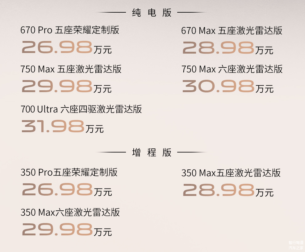 增程版车型搭载增程器以及250千瓦后置单电机,最大扭矩430牛·米,匹配60.21千瓦时三元锂电池组,CLTC纯电续航350km,综合续航超1200km。