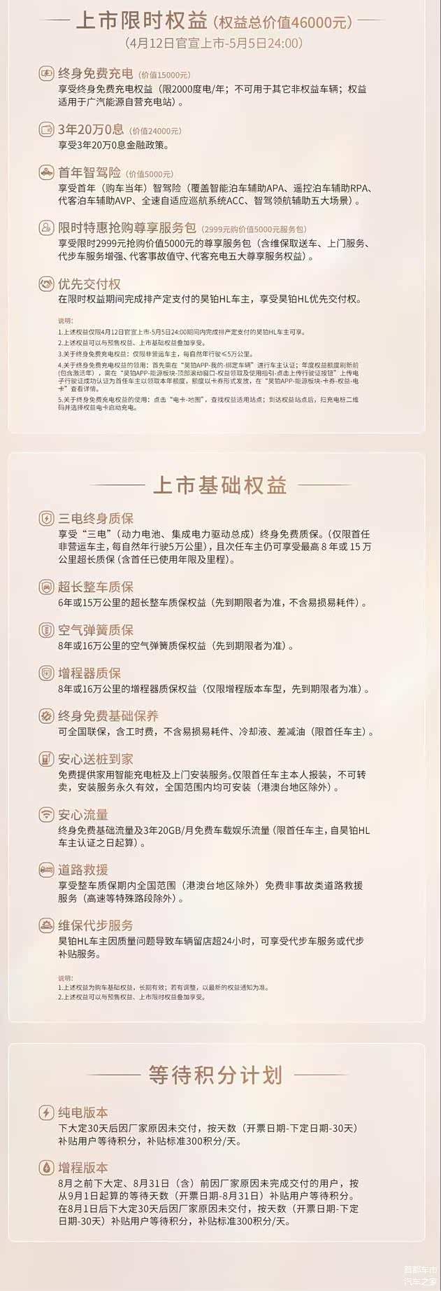 即日起至5月5日,购买昊铂HL的用户还可以享受到多重专属权益:除去三电终身质保、超长整车质保等上市基础权益,还可畅享终身免费充电、3年20万元0息金融政策、智驾险等多项限时专属福利。
