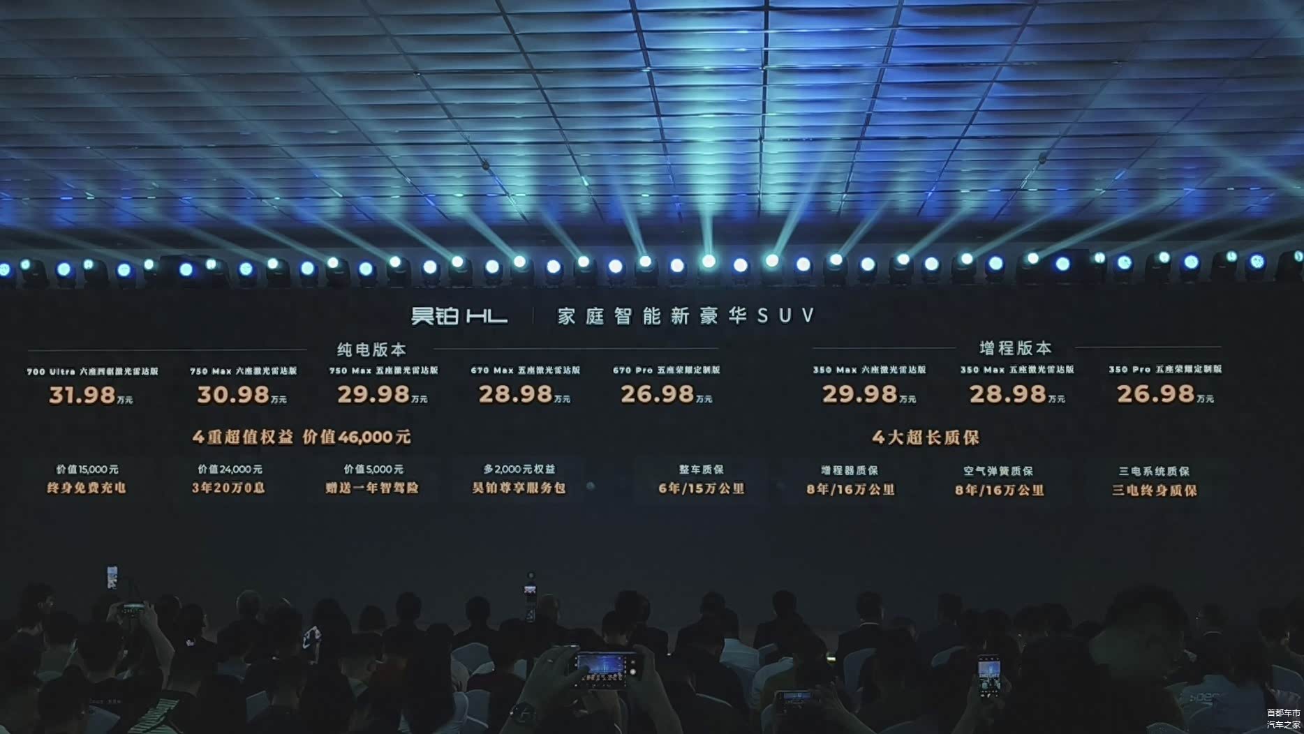 昊铂品牌焕新后的首款旗舰产品——昊铂HL也在科技日现场正式上市。新车提供了纯电/增程两大动力选择和五座/六座两种布局方式,共8款车型。官方指导价区间为26.98万-31.98万元。