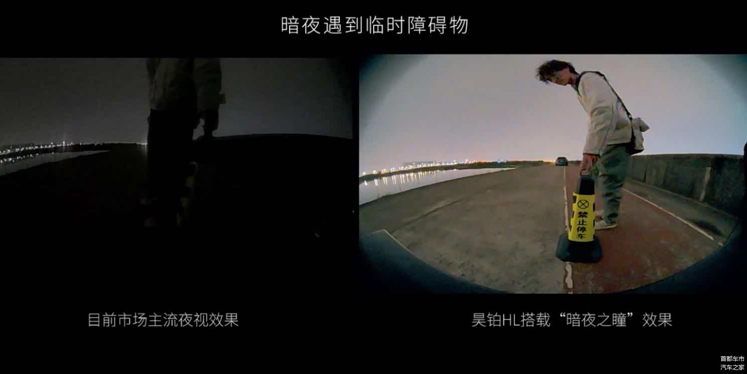 夜间安全方面,昊铂HL搭载行业首发的“暗夜之瞳”军工级夜视系统,通过像素级AI成像引擎及微光色彩重构技术,让夜间行车获得接近白昼的视觉效果,提升夜间行人、动物及周边障碍物的识别率,实现昼夜无缝安全守护。