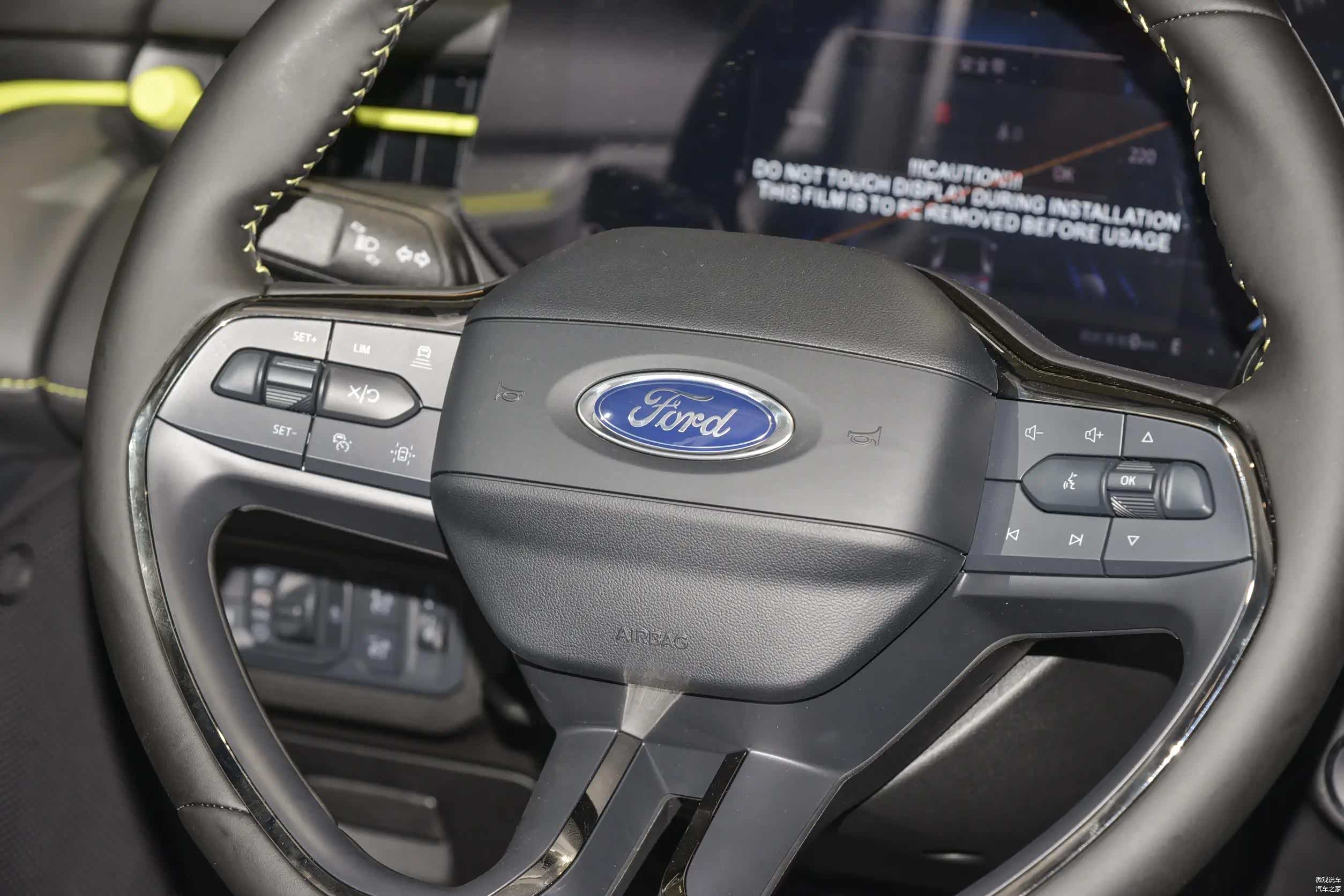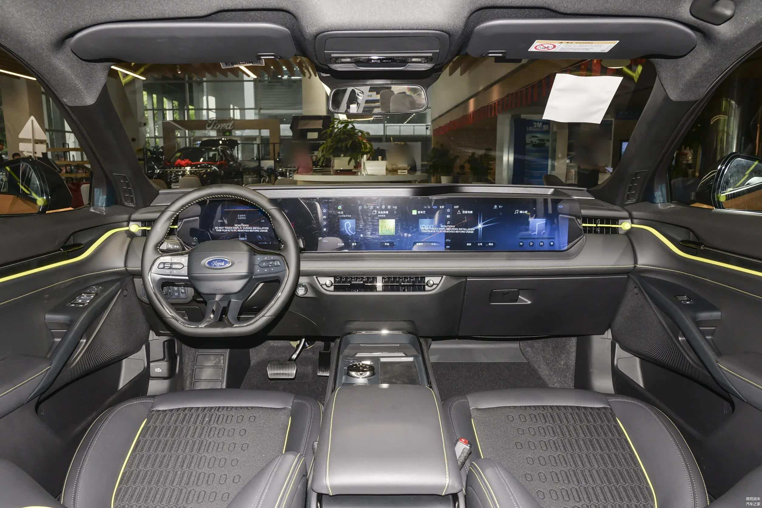 内饰设计充满科技感,12.3英寸全液晶仪表盘与27英寸的4K分辨率中控屏融为一体,贯穿整个中控台。三幅式方向盘设计简洁且握感舒适,旋钮式换挡机构则进一步提升了内饰的科技氛围。搭载的SYNC+2.0车机系统功能强大,支持OTA升级和语音识别控制,能够精准响应驾驶者的指令,操作流畅且智能化程度高。车内还配备了10个扬声器的B&O音响系统,为驾乘者带来沉浸式的听觉享受。