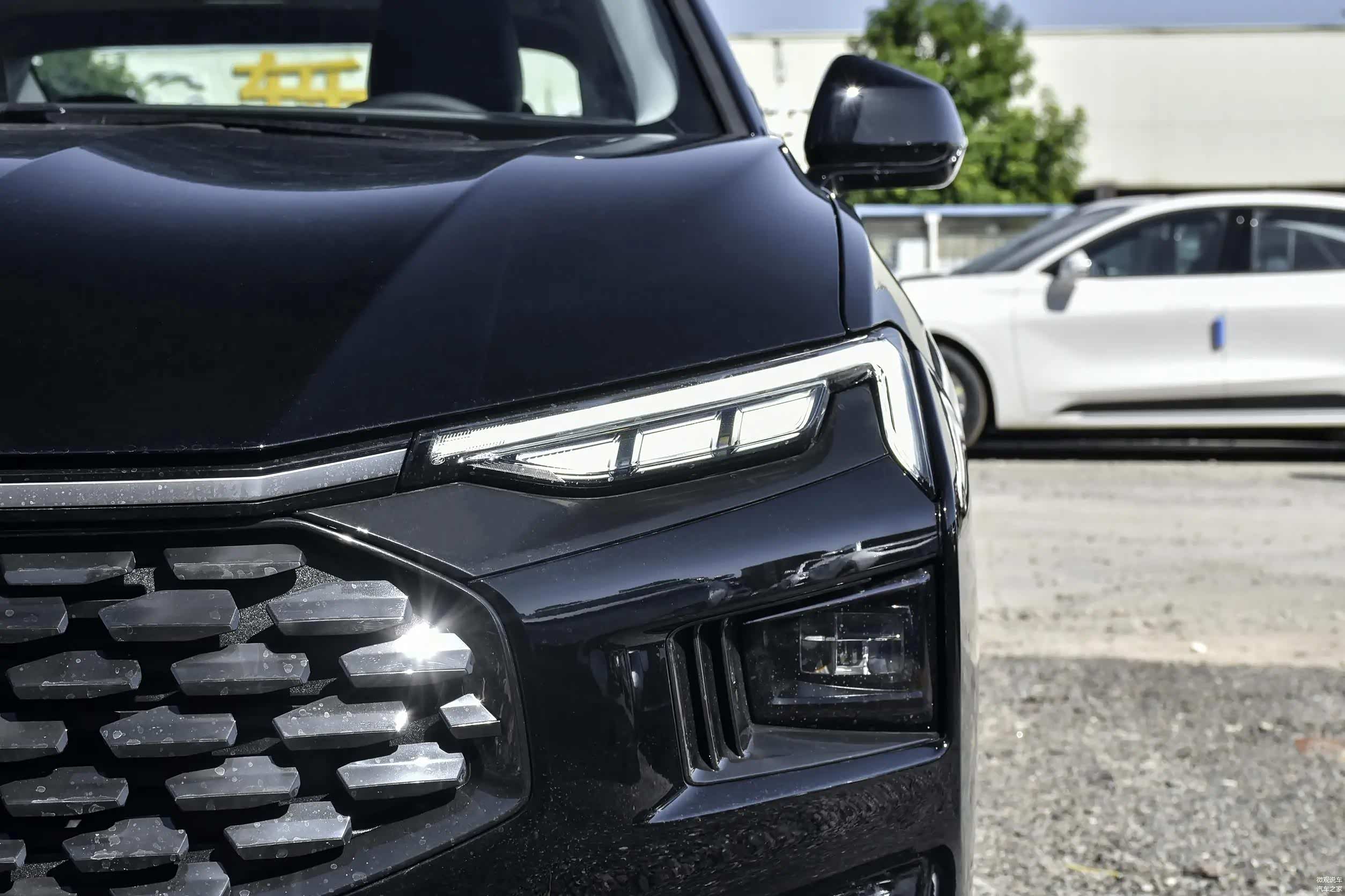 外观设计延续了家族化的设计理念,整体造型充满力量感与运动气息。车头部分采用扁平化设计,视觉上更具张力,引擎盖上多条隆起的肌肉线条进一步强化了这种力量感。大尺寸的进气格栅与两侧犀利的大灯组连成一体,内部条幅采用阵列状结构并经过熏黑处理,增添了前脸的精致感与攻击性。下方三段式进气格栅设计独特,中间部分粗壮,两侧逐渐收窄,搭配突出的前唇造型,进一步凸显了车头的肌肉感与运动氛围。
