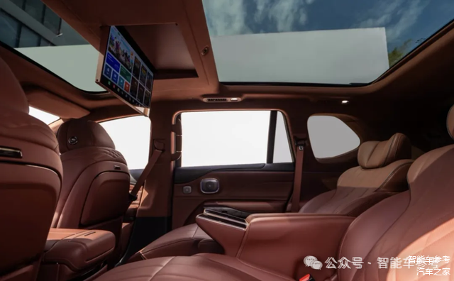 然后是舒适性,搭载了城区NOA让前排车主开着更节省精力,二排双零重力座椅让老人躺着舒服,上面的吸顶屏可以给孩子放个教学视频动画片,下面的冷暖箱还能给孩子热个奶,冰个汽水儿。