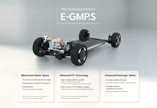 图:PV5基于全新平台E-GMP.S(Electric-Global Modular Platform)平台打造,当中的“S”(for Service)定义为滑板底盘结构,通过集成模块化架构(IMA),允许不同的车厢设置在底盘上,旨在实现个人和商务用途之间无缝过渡。