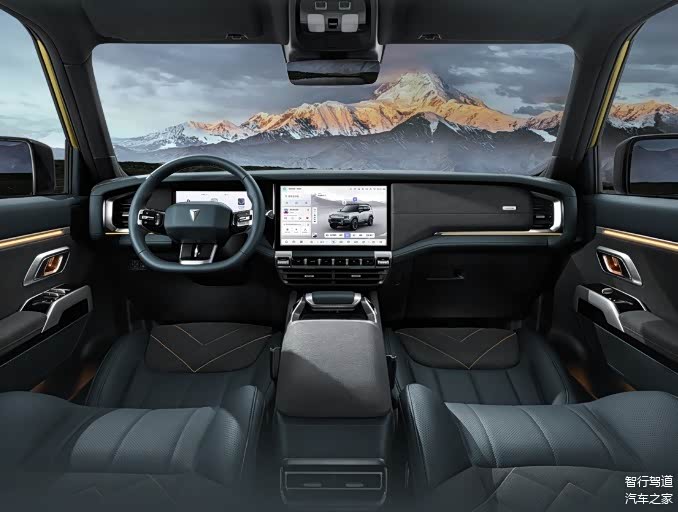 内饰延续硬派风格,采用大量软质材料,细节处加入棕色缝线,提升豪华感。配置方面,车内配备12.3英寸全液晶仪表和14.6英寸中控屏,支持多主题模式切换和车机AI功能。座椅支持加热、通风和按摩功能,后排座椅同样配备舒适配置。空间布局为5座,车内空间宽敞,后备箱规整且容积大,提供220伏电源,满足长途出行需求。