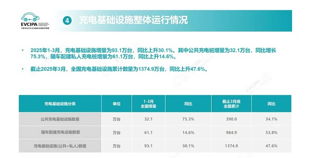 中国充电联盟公布了2025年3月全国电动汽车充换电基础设施运行情况。从整体规模来看,截至2025年3月,全国充电基础设施累计数量已达到1,374.9万台,与去年同期相比呈现出显著的增长态势,同比上升幅度高达47.6%。