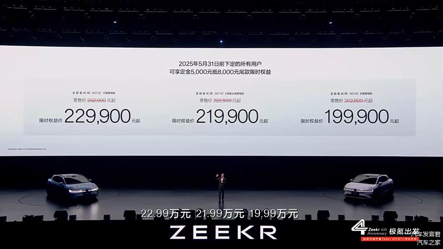 2025年4月15日,极氪品牌旗下第二款猎装车——极氪007GT正式上市,共推出3款车型,售价区间20.29-23.29万元,限时权益价19.99-22.99万元。新车由现款007衍生而来,是极氪007的猎装版车型,基于800V平台打造,外观内饰均进行了升级,同时全系标配激光雷达。