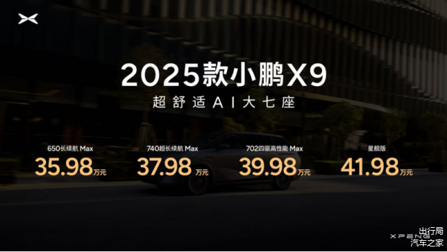 2025年4月15日,小鹏汽车在香港举办了一场面向全球消费者的发布会,正式推出全新升级的七座家用车——2025款 小鹏X9(图片 | 参数 | 询价)。这款被称作"移动的舒适城堡"的新车共推出四个版本,售价从35.98万元到41.98万元,即日起接受预定,前5000名支付定金的用户还能享受多重购车福利。