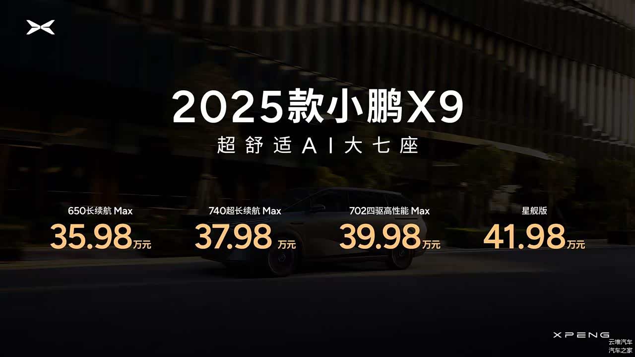 2025年4月15日 中国香港, 小鹏汽车在“全球热爱之夜”发布会上正式推出MPV升级款-2025 小鹏X9(图片 | 参数 | 询价);共推出4款车型,覆盖不同续航与配置需求,售价区间为35.98万-41.98万元。全系标配全域800V高压平,图灵AI智驾系统、零重力座椅、主动式后轮转向等核心功能;同时提供多项选装配置,满足用户个性化需求。