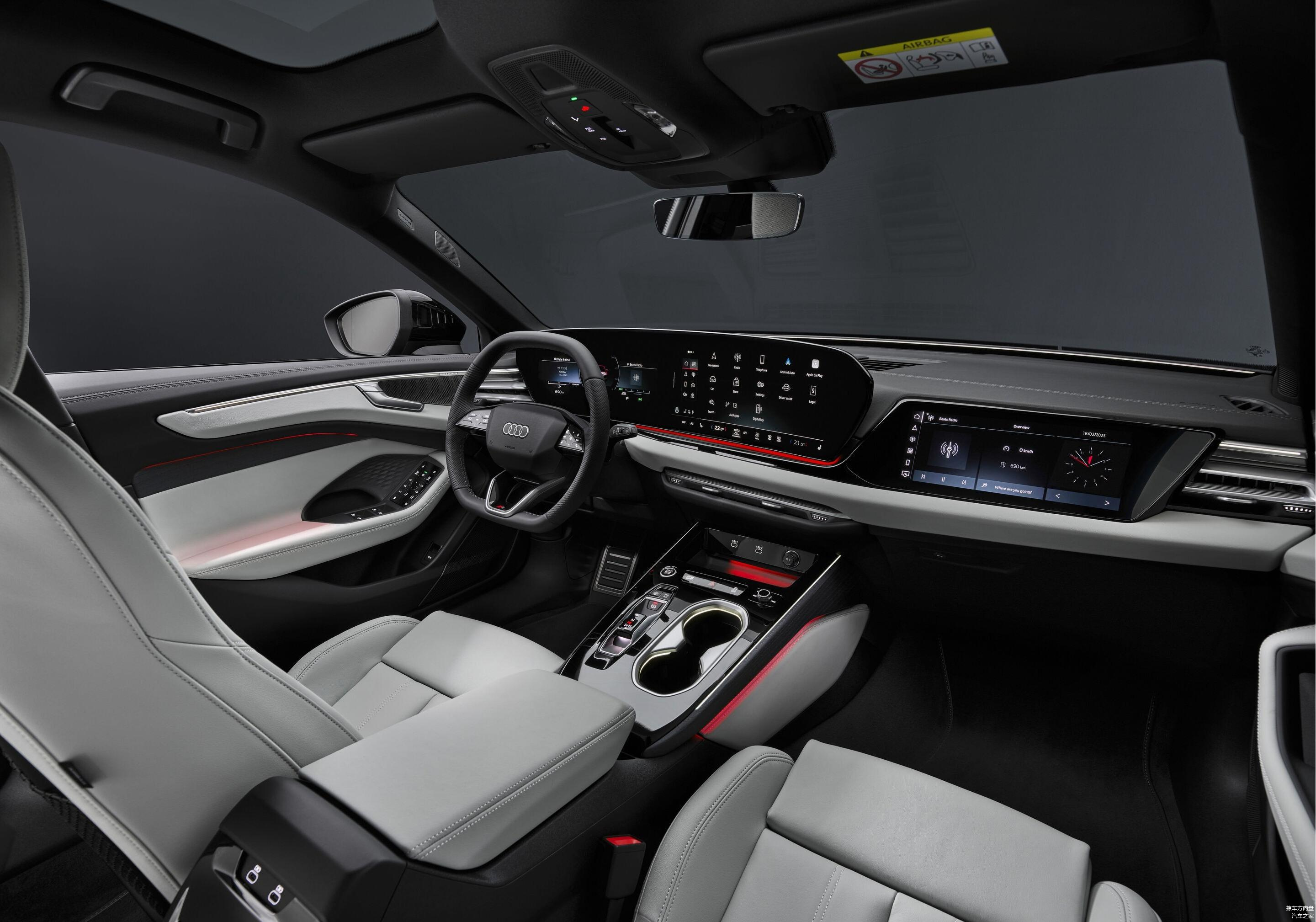 这套源自Q6 e-tron的设计理念,首次在燃油车型上落地,屏幕支持动态隐私模式:当车辆行驶时,副驾屏将自动屏蔽视频内容以确保驾驶安全;若未检测到乘客,屏幕则会切换为数字背景画面。四辐式方向盘与电子滑块换挡机构进一步简化了操作逻辑,副仪表台也因此更显简洁。