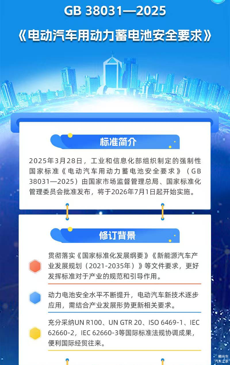 近日,工业和信息化部组织制定的强制性国家标准《电动汽车用动力蓄电池安全要求》(GB38031-2025)获批发布,将于2026年7月1日起正式实施,被业界称为“史上最严电池安全令”。