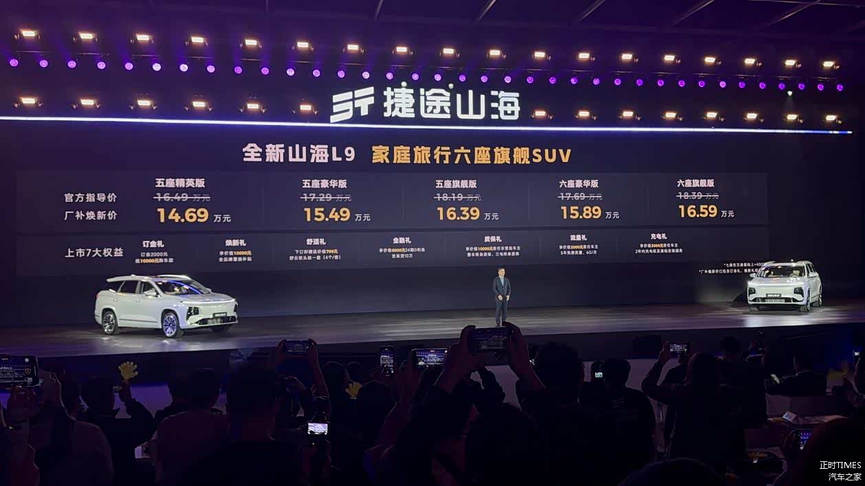4月15日,捷途全新 山海L9(图片 | 参数 | 询价)上市,推出5个版型,指导价16.49万元至18.39万元,还推出厂补焕新价,为14.69万元至16.59万元。