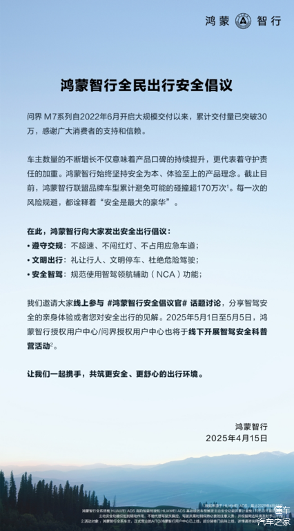 为了用户的安全,鸿蒙智行也是操碎了心,4月15日,鸿蒙智行发起了全民出行安全倡议,提倡遵守交规、文明出行,并特别强调了规范使用智驾,共建更安全的智慧出行生态。