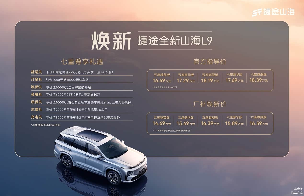4月15日,捷途家庭旅行系列旗舰之作——全新 山海L9(图片 | 参数 | 询价)正式上市。新车共推出5个版型,官方指导价16.49万元至18.39万元,加上厂补焕新价后,新车价格进一步拉低,为14.69-16.59万元。