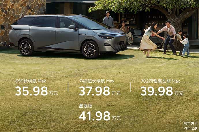 新款车型共分为4个版本,售价区间在35.98-41.98万元。其中最具性价比的,应该是37.98万元的740超长续航MAX版本:除了极其丰富的标准配置,只比入门版多花2万元,轮胎尺寸可以从19英寸升级了20英寸,还有105度的三元锂电池,续航能力飙升。