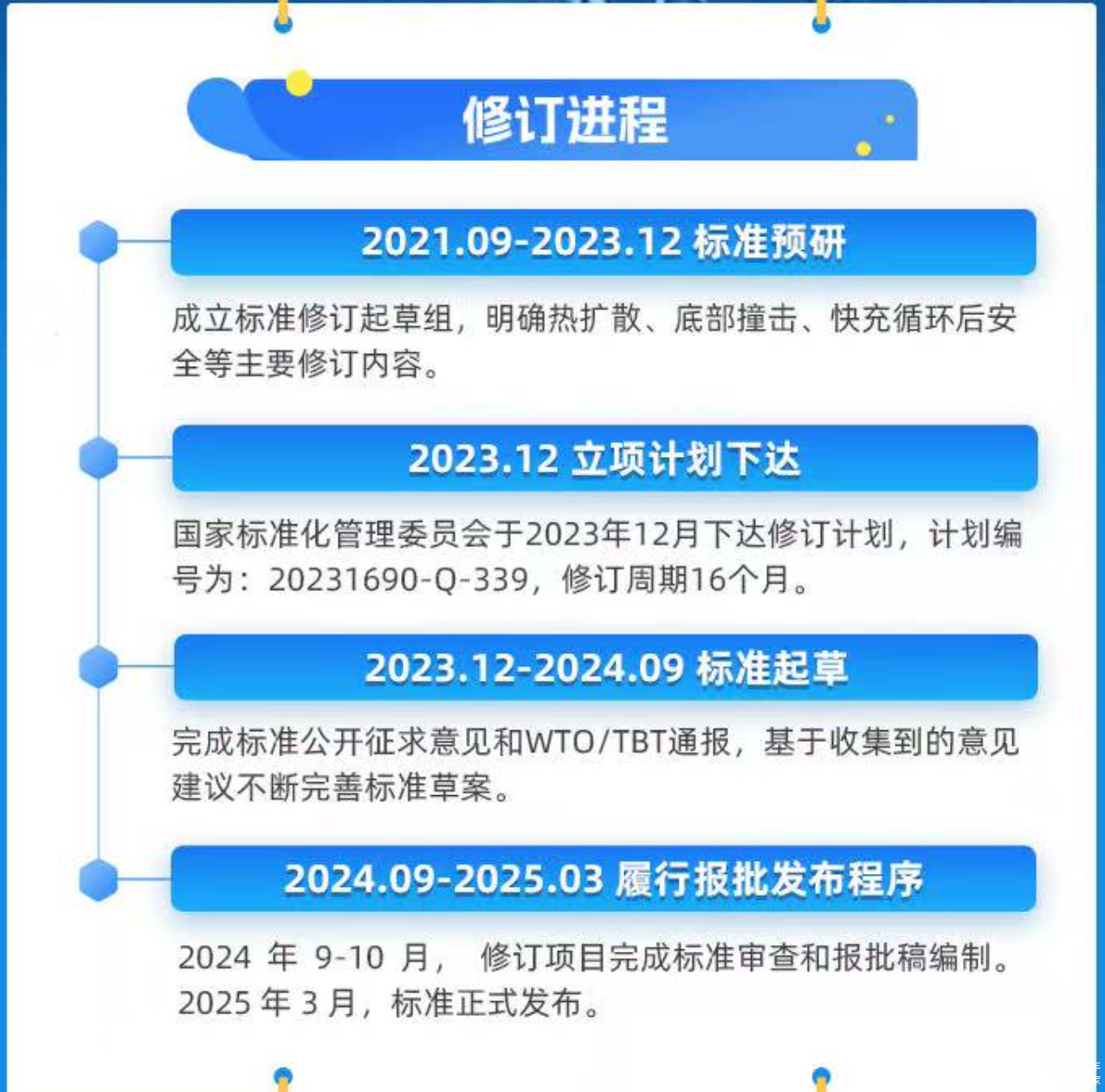 从工信部官网披露信息来看,新版《安全要求》从2021年9月就开始成立标准修订起草组,并明确热扩散、底部撞击、快充循环后安全等主要修订内容。