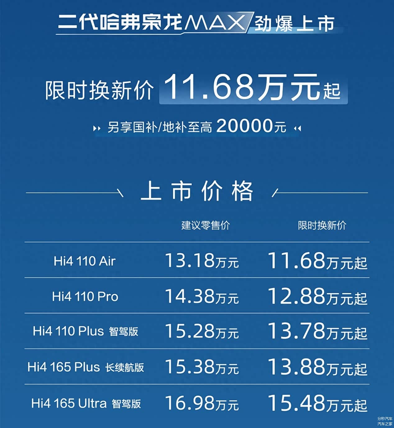 根据官方公布的信息,二代哈弗枭龙MAX的售价如下: